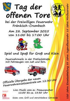 Am Sonntag, den 28. September wollen wir gemeinsam die drei Jubiläen in der Feuerwehr Fränkisch-Crumbach feiern.