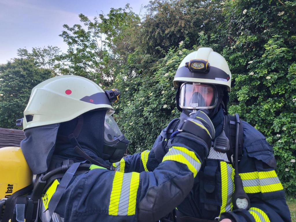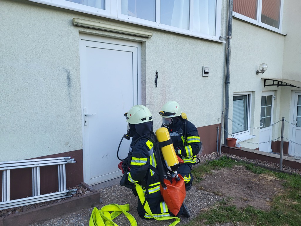 Feuer in einer Wohneinrichtung für Senioren, mit diesem Übungsszenario setzten sich die Einsatzkräfte im Mai auseinander. Nach einer sorgfältigen Erkundung war schnell klar, es handelt sich um den Werkstattbereich und es gibt noch keine Ausbreitung in Richtung Wohnbereich. Schnell rüsteten sich die Trupps mit Atemschutz aus um in den angenommenen Brandraum vorzugehen. Dort wurden zu diesem Zeitpunkt zwei Personen vermisst.