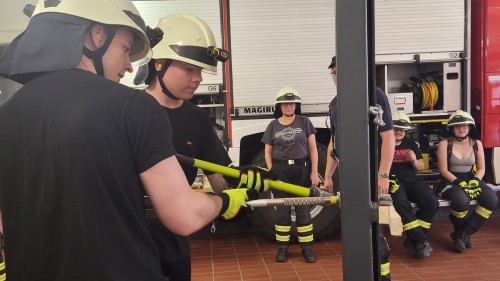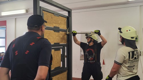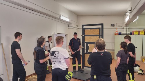 Nach einer kleinen Demonstration ging es für die Anwesenden Truppweise, immer zu zweit, mit dem Halligan-Tool und einem Hammer an die Übungstür um diese schnell zu öffnen.