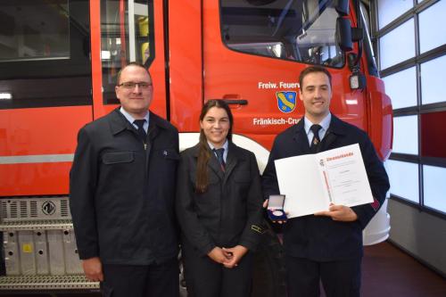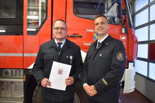 Eine besondere Ehrung erhielt an dem Abend Gemeindebrandinspektor Stephan Fehr. Für besondere Verdienste um den Brandschutz wurde ihm das silberne Brandschutzverdienstzeichen am Bande durch Kreisbrandmeister Bardonner verliehen.