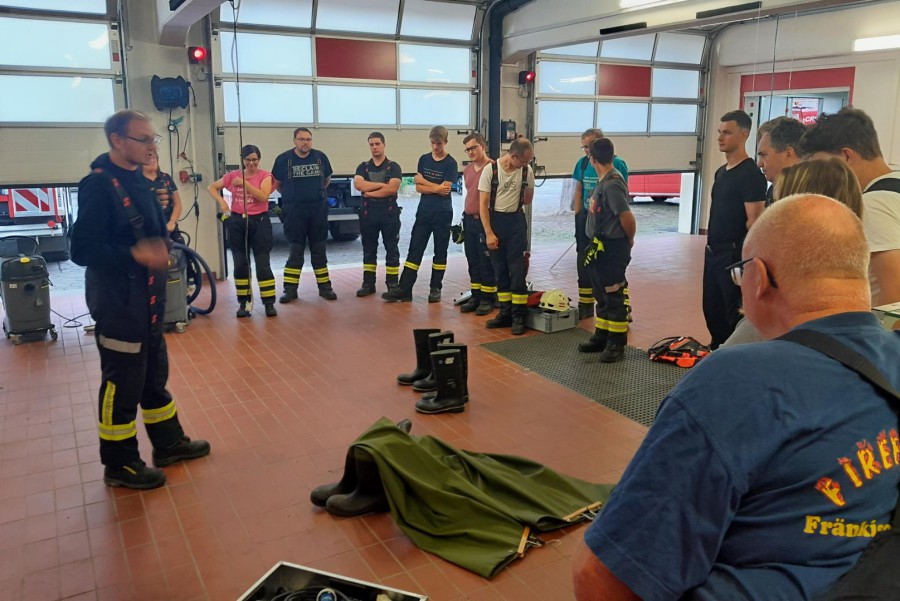 Aber auch Handwerkszeug und Schutzkleidung wurden vorgestellt, wie die unterschiedlichen Wasserschieber, Gummistiefel oder für höheres Wasser die Wathosen, die in der Feuerwehr vorhanden sind.