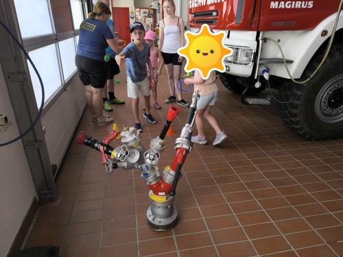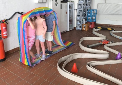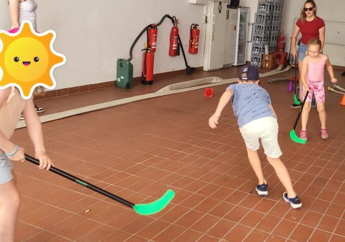 In der letzten Ferienwoche stand für die Minis Spiel und Spaß auf dem Plan. Am bisher heißesten Tag im Jahr fanden fast alle Spiele in der Fahrzeughalle im Schatten statt. Begonnen wurde mit einem Hockeyparcours, der so manches Hindernis aus Feuerwehrgegenständen bereithielt. Im Anschluss konnte eine Runde Hockey gespielt werden.