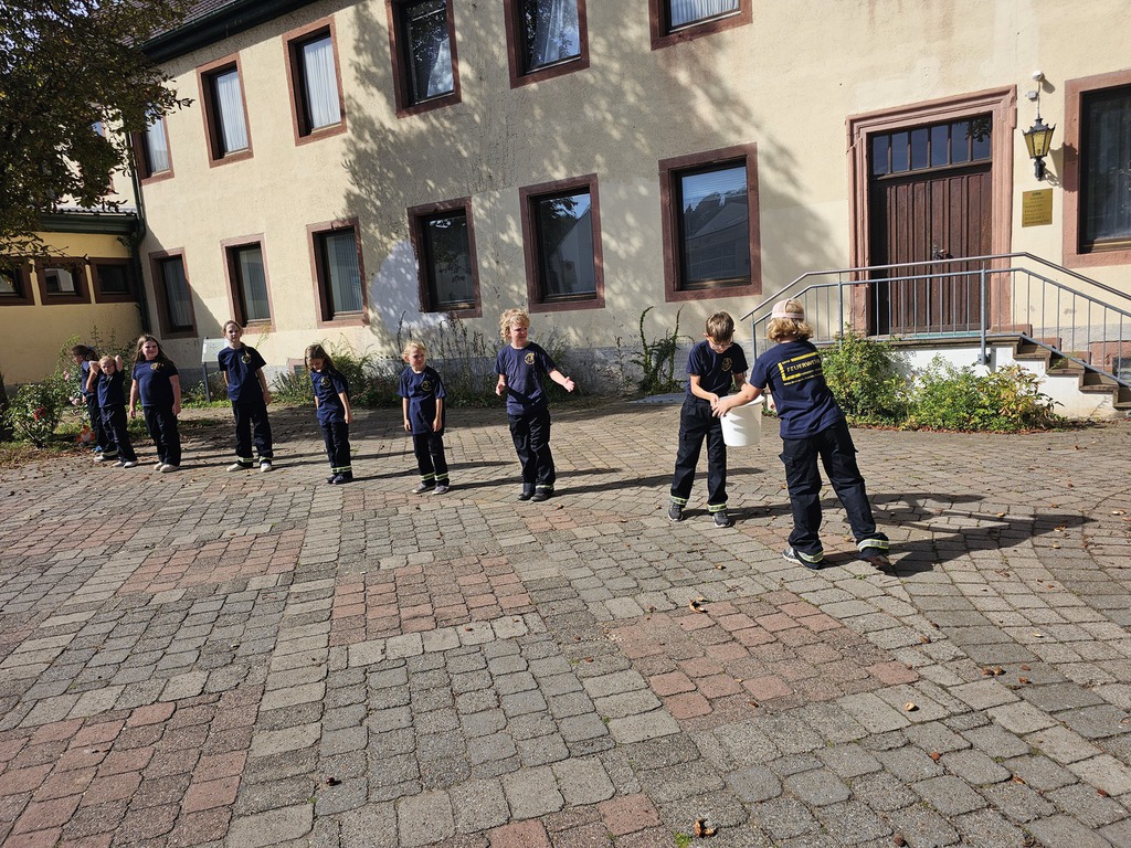 Zum Schluss der Abnahmen stand bei jeder Gruppe eine Teamleistung auf dem Plan. Die Minifeuerwehr löschte eine „Flamme“ mit Hilfe einer Eimerkette und das in Bestzeit.
